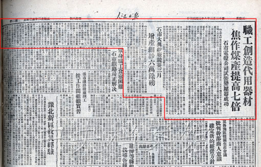 3. 1949年3月30日,《人民日报》关于焦作煤产提高七倍及石市纱厂增产细纱六万余磅的报道