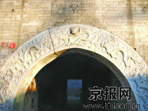 岱王庙坐落在卢沟桥西侧的桥西街5号,坐北面南。远远望去,岱王庙建造的十分精巧,醒目。当地百姓俗称它为大王庙或大庙。岱王庙的山门和戏楼,平面呈T字形布局,衔接紧密,融为一体,是一座上下二层硬脊歇山顶砖木结构的建筑。历经沧桑岁月,房脊两头的吻兽早已踪迹皆无,只有东西山墙顶部的铃铛排山,保留的还算完整。整座建筑用青砖砌成,磨砖对缝,对仗工整,呈现了清时期的建筑风格。山门的一层中央是石制拱形券门,券门两旁是各一长方形竖窗。石制拱形券门刻有石雕,门首弧顶上方雕刻着探首的夔龙,在片片的祥云中翻转腾挪,吞云吐雾。夔龙两侧各刻有两条玩耍的蟠龙,像众星捧月一样游弋在探首的夔龙身边。最为有意思的是,石制拱形券门两侧下部的石雕上,各刻有一只在水中山石间吐水的小兽,造型奇特,形态逼真,显现出十分生动有趣的画面,给整座石雕增添了一笔顽皮的色彩。整个券门上的石雕布局严谨,古朴典雅,雕工洒脱,庄重中不失谐趣,显示出那个时代工匠们的高超技艺。