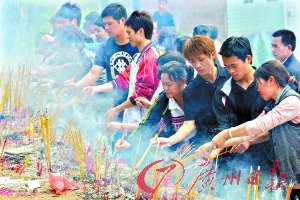 昨天的叶氏祭祖现场,记者发现一个有趣的现象,前来祭拜的叶氏后人不单有南番顺口音、粤西口音、客家口音、普通话,甚至连祭祀的仪式也都不一样。其中来自广东信宜的叶氏后人在祭祀的过程中还有专职人员吹唢呐,来自东莞的后人则在烧猪头上挂朵大红花,而来自花都、清远的叶氏后人更是舞起了麒麟,十分有意思。