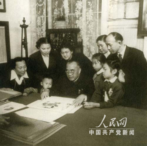 1958年,朱德、康克清和李伯钊(左侧)在北京荣宝斋。朱德身后为朱敏,右侧小孩为外孙刘建。