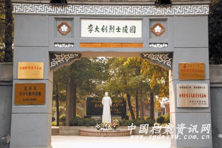 在万安公墓苍松翠柏间有一座青砖围砌的小园,中国新文化运动先驱和中国共产党创始人之一的李大钊烈士就长眠于此。1927年4月28日奉系军阀张作霖将李大钊等20位革命者残酷地杀害。1933年4月才被安葬在万安公墓,1983年3月其灵柩移葬于新建的陵园中。在陵园正中矗立着一尊汉白玉的烈士全身雕像,昂首挺立,雄视前方,表现出一位革命者的浩然正气。出陵园不远安葬着与李大钊一起被奉系军阀杀害的邓文辉和路友于两位革命烈士,他们和李大钊一样,面对敌人的绞刑架,毫无惧色,英勇就义。