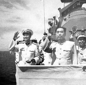 当天,离阅兵还有一小时,青岛海军基地机关、学校、部队组成的军官队伍已经整整齐齐地排列在码头上。东海舰队司令员陶勇率领的我国自行装配的护卫舰“昆明”号和另一艘军舰也由上海赶到青岛,接受总理的检阅。9时许,周总理一行在肖劲光的陪同下来到了码头。