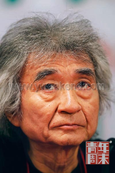 3点45分,小泽征尔终于出现了。你很难把这位传奇音乐家与他73岁的高龄联系起来。他有着年轻人一样的精神面貌,目光炯炯有神,步履轻快有力,动作灵活敏捷。入座后,记者以为他会因迟到谦逊地跟大家道歉,结果他语出惊人——“国家大剧院太大了,我一进来就转向,找了半天才找到,哟,你们不错啊,都能找到,真厉害。”在场记者被他逗得哈哈大笑。