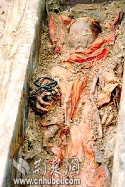经过昨日的整理,前日在荆州出土的古尸(本报昨日报道)已被确定为是一具女性干尸,根据随身出土的饰物,考古人员分析该女尸生前信佛,可能是名尼姑。“五一”期间,该古尸将在荆州博物馆展出。