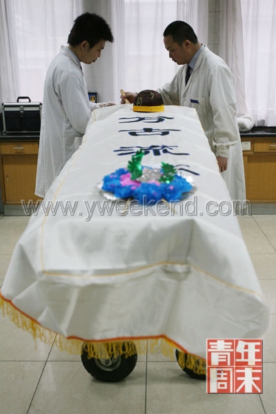 北京时间早7点,外面淅淅沥沥下着雨,不大的工作间早已忙碌开来。医疗推车上躺着一位老者,一位戴着口罩,穿着白大褂的年轻人正用酒精给老人擦脸,一点儿点儿,轻柔的,从眼角到下颚,紧接着他把干净棉布塞进老人的鼻子和嘴里。此时,一个工作人员悄悄问记者:“你看,他(老人)像不像睡着了?