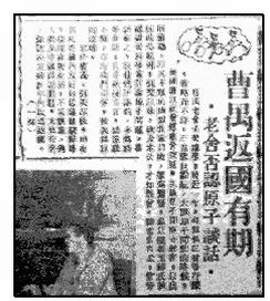 曹禺老舍去美国讲学,将近一年,报间偶记彼等行踪,皆略而不详。正当举世纷纭,大议原子弹的时候,美国通讯社曾传老舍谈话,主张原子弹应守秘密,以出制苏联。以其不类此幽默作家口吻,群为惊怪。最近随冯玉祥氏挟国的吴组缃,到美以后,询及老舍,才知误会。据老舍自云,曾旁听欧美科学家讨论原子问题,事诚有之,但他们所讲的,多为科学术语,且多欧洲方言,听还听不懂,岂有班门弄斧,发表谈话的道理。