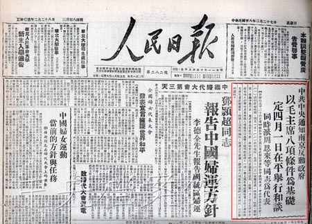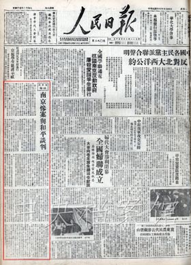 4月1日,由张治中、邵力子、黄绍竑、章士钊、李蒸、刘斐组成的南京国民党政府谈判代表团到达北平,周恩来等设宴招待。以周恩来为首席代表,林伯渠、林彪、叶剑英、李维汉、聂荣臻为成员的中共代表团,开始与国民党代表团举行和平谈判。4月15日,形成八条二十四款的《国内和平协定》。但结果,南京政府拒绝接受协定,彻底暴露了假和平的真面目。