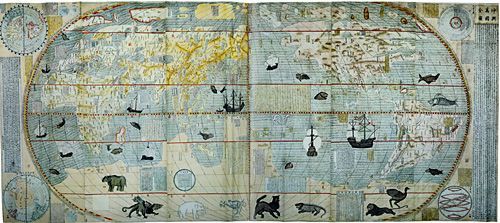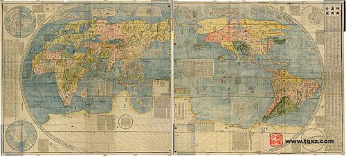 【编者注】下面这幅彩色坤舆万国全图编辑者是日本人新井白石,而新井白石的采覧异言以及彩色版地图(1708年版),根源自明朝的李之藻1602年版单色地图,而李之藻的地图又是修改自利玛窦的1584年首版单色地图。该图收藏者是“狩野氏图书”。即狩野直喜(1868-1947),明治时代的中国通,文史研究学者。故此,图上有日文译名,但内容资料上,日本编者仅在地名上有所编补,核心资料仍采自李之藻原图。