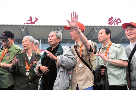 16时许,这批年龄都在80余岁左右的“四川老兵”陆续来到了报社门口集合。大家的表情显得有些兴奋,虽然是临时接到接机的通知,老人们还是精心准备了一番,每个人都戴上了建川博物馆送给他们的纪念抗日战争胜利60周年徽章,82岁的王世雨老人的左胸上,更是戴满了记录着他峥嵘军旅生涯的各式奖章。