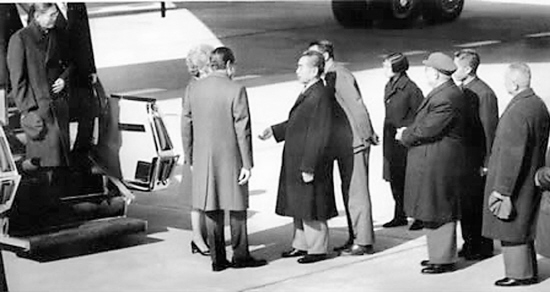 专机于上午11时30分抵达北京东郊首都机场。尼克松总统与其夫人并排手挽手顶着寒风,稳步踏上专机舷梯。然后尼克松总统抢先一步走下舷梯,主动伸出右手,周总理小步上前,也伸出手来,两只手热烈有力地紧握在一起。美国国务卿杜勒斯在1954年日内瓦会议期间拒绝与中国总理周恩来握手的时代,终于过去了。