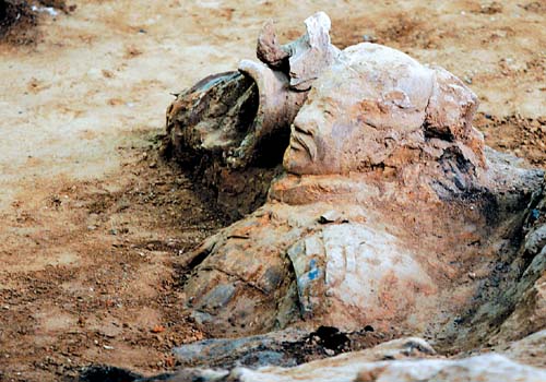 今晨,在即将发掘的200平方米区域内,考古人员正在做着最后的准备工作,现场安装了温湿度控制仪,随时监控发掘区内的温湿度变化。据介绍,此次发掘区域曾在第二次发掘时就已进行了探测,当时为了更好地保护兵马俑,对这部分进行了回填。为准备今天的发掘,考古人员从5月初就着手将原来的浮土进行了清理,截至记者上午发稿,已有6尊兵马俑部件露出了地面。