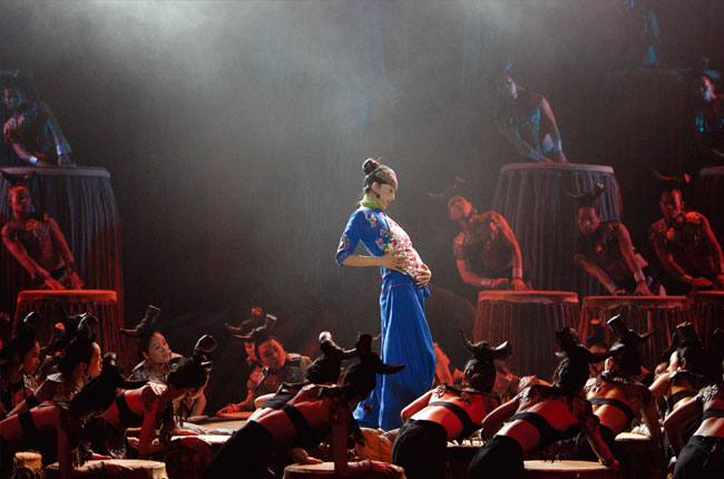 这场名为《催生》的戏里,烟雾弥漫、灯光昏暗,让气氛显得有些阴森,仿佛处于阴阳两界之间。杨丽萍是全村最美丽的女子,她挺着大肚子,沿着鼓铺成的路,如同走向祭坛般,踯躅蹒跚。接下去的那段舞,也许算不上真正的舞蹈,因为那完完全全是临盆前的辗转和挣扎,杨丽萍面带浓重的妆容,甚至使得痛楚的神情显得狰狞。这是杨丽萍新剧《云南的响声》的第一幕,最后,所有的鼓声都停止了,舞者平静地躺在鼓面上,看不出是生是死。