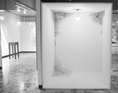 记者昨日在展厅见到,这件装置艺术展品名为《不能知道的事儿》,占地约一平方米,作品是一间开放式的小屋,“屋”中央挂有一盏昏暗的白炽灯,“小屋天花板”的角落里有一片片的“水渍”,水渍上是一张张孩子的可爱笑脸。