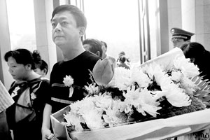 朱军手捧的花束由菊花和季羡林生前最喜欢的荷花组成。记者注意到,在来宾签名册上,他签下的名字是朱一军。