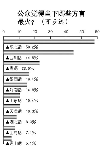公众觉得当下哪些方言最火?调查中,58.2%的人首选东北话,四川话以44.8%的支持率排名第二,23.0%的人选择了粤语,排第三。接下来还有陕西话(16.4%)、河南话(14.8%)、山东话(10.4%)、天津话(10.3%)、湖北话(8.3%)、上海话(7.1%)、唐山话(5.1%)等。