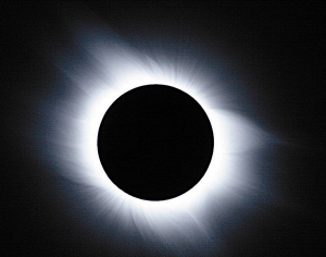 一旦太阳被完全遮住,你可以看到日冕的整个光环,它的亮度和满月差不多。通常,因为蓝色的太空你看不到它。