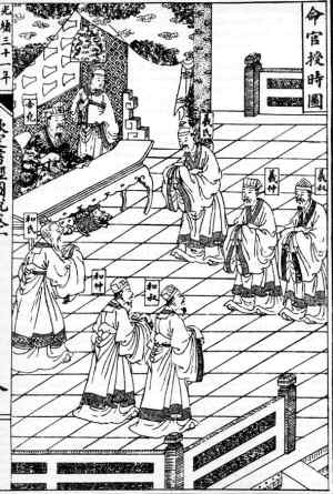 制定历法,就是“观象授时”,对统治者来说是最重要的事情。天文历法象征着帝王“君权神授”的统治权威。传说尧帝就命天文学家羲、和二氏进行天文观测以制定历法。《尚书·尧典》说:“乃命羲和,钦若昊天,历象日月星辰。”当时是以观测日出方位和黄昏时中天的恒星来确定季节。根据书中记录的“中星”天象,可以推断尧帝“观象授时”的年代约在公元前23世纪。当时制定的历法是一年有366天,以置闰月的方法保持与季节同步。