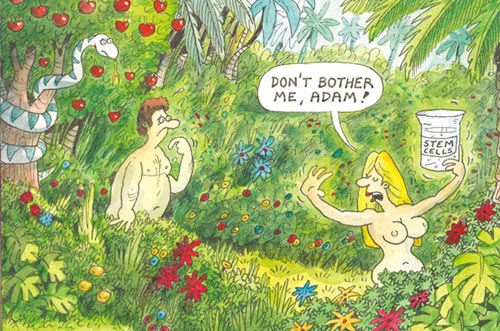 7月9 日,英国《太阳报》登出一张漫画,在漫画中,置身于伊甸园中的夏娃手持一只贴着“干细胞”标签的烧杯,一脸傲慢地说:“亚当,请别烦我!”对事件的中心人物纳伊尼亚教授而言,伦理上的质疑和争议似乎并没有给他带来什么困扰。他认为此项研究可以为那些想要孩子却没有能力的家庭带去福音,而争议则“完全可以通过法律最后进行规约”。面对纷至沓来的媒体,纳伊尼亚教授仍沉浸在实验成功所带来的兴奋之中:“这太令人兴奋了!这些人造的精子有头,有尾巴,也可以移动,它们具备能够产生生命的一切特质!”