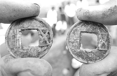 考古人员的动作越来越轻,墓葬的北头、中部不断有铜钱被发掘出来。经现场的考古人员确认,这些都是汉代的五铢钱。记者看到,这些方孔铜钱上的“五”、“铢”两字十分明显。