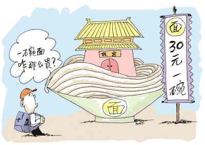 机场过去也把一碗面卖上天价,现在一些机场悄悄地把价格调下来了,因为过去打得起“飞的”的,非富即贵,现在不同了,平民百姓也成了常客,调整价格就是为了适应这一需要。况且机场逗留的时间总是短暂的,就算你不吃这碗面,撑一撑也就过去了。只有故宫的面你没得选择,除非你愿意拿凉水就着面包顶一顿,好不容易来趟北京游次故宫,这么着真有点对不起胃了。
