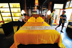 东长房观众服务区,工作人员在整理故宫特色商品,仅有一套的云锦缂丝寝具(五件套)标价888888元。与30元一碗的面相比,这套云锦缂丝寝具才是真正的天价。