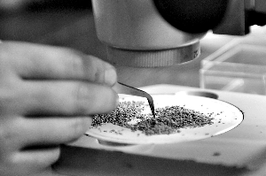 在实验室中,发掘人员用显微镜仔细观察每一小拨细沙。