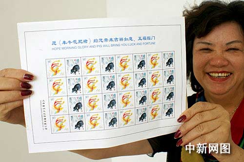 中新江苏网盐城8月17日电 (于从文 徐德钰 李根) 上海吴女士16日来到江苏盐城,展示了以罕见的徐悲鸿画猪图为主题的个性化邮票设计效果图。该连体邮票画面中,一只火红的剪纸凤凰和一只黝黑的国画猪相映成趣,给人以独特的视觉感受。目前,这套邮票已经交付印刷,将在本月底发行。