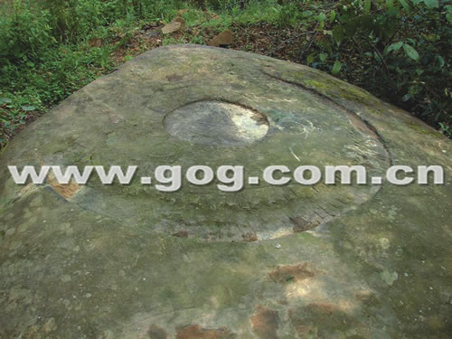 最为明显的是巨石表面用铁器凿成的圆形图案,该图案是由一个直径约1.5米未连接的半圆,围住一个直径约0.6米的小圆,半圆的线条是被凿凹进去的,每隔约3厘米便有一根竖线,而被围在中间的圆心也是阴刻的,上面纵横着凿刻的线条,在圆心两侧,还有两个星形的小圆圈。