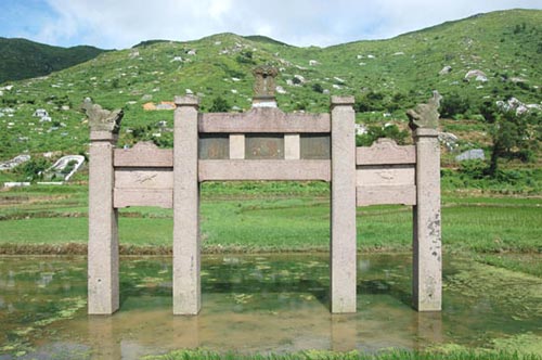 据“浙江文物网”消息,该节孝牌坊位于苍南县金乡镇洪岭下村牌坊底,坐东南面西北,为三门四柱冲天式牌坊,总面阔约5.67米,其中明间面阔2.59米,次间1.36米,总高约4.85米。整体用花岗岩分件雕刻拼装而成。四柱呈一字平面落于长方形基座上,前后未见圆镜靠背石,基座已没入水底,石柱花岗岩质地,下半部分为抹角方形,上部分则为方形,边长0.36米,中柱较边柱为高,各柱柱头皆置方斗,明间柱头置蹲狮(已盗),次间置鸱尾,多建于屋脊正吻,较少用于牌坊。牌坊明间最下方为一道方形额枋,作为主要承重构件,西北面阴刻“为故儒童陈凤姚妻张氏立”,枋端部略呈弧形,枋上刻出二直角折柱,承托上层的平板枋,折柱间做成匾额形式,中间刻“节孝”二字,前题“温州府知府郑云 温处兵备道杨瑾 温州布政使司国栋 平阳县知县汪增荣 儒学教谕卢镐 儒学训导朱凤藻”等官名,落款为“浙江学政彭元瑞 浙江巡抚王亶望 浙闽总督杨景素 请 大清乾隆四十五年黄钟月 建”;平板枋断面略呈扁方形,中部向上凸起,承“圣旨”字匾,匾额下部做成须弥座样式,上部用剔地起突法深浮雕一龙头,匾周沿刻双升龙,栩栩如生,十分形象;次间额枋较明间为低,素白无饰,与压板枋间为一整体花板,左右花板各阳雕神鹿、麒麟等吉祥图案。