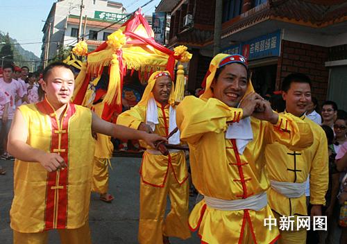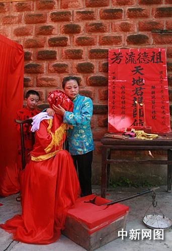 头顶红盖头的“新娘”在“出阁”前的“哭嫁”让众人啧啧称叹。记者在现场看到,在经历了踩斗、丢筷子、骂媒、父亲压轿等传统习俗后,“新娘”紧紧抱着自己的“母亲”哭道,“女儿家女儿外相,十七八岁选才郎,倘若奴身是男儿,早晚二时奉高堂。”据当地居民介绍,“哭嫁”的顺序为哭爹娘、哭婶婶、哭叔娘和哭姐妹。不少情侣在看完“新娘”的“哭嫁”完后,连连称赞其“哭功”了得,堪称一绝。随后,“新娘”由“哥哥”背上花轿。穿长马褂、胸戴大红花的“新郎”则坐上另一台轿子,带着女方配置的婚嫁用品浩浩荡荡地返回“新郎”家。