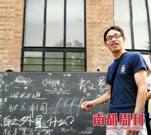 小黑板抬了上来,上面写着“黑白之外是什么?答案就是黑白之内。”面对这么多观众,范美忠略显紧张,他拿起粉笔写了“教愚”两个字,“同学们,今天我们上历史课。”