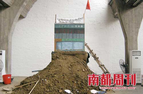 15日上午10点多,距离下午3点开幕不足5个小时,正在时态空间画廊布展的艺术家听到消息,不得不停下手头工作。展厅西侧,用泥土和木箱装置的“最牛钉子户”微缩景观还未完工,“管委会已经来警告了我们,要求把钉子户上的红旗和‘公民的合法的私有财产不受侵犯’横幅取下来。”行为艺术单元的另一个策展人袁霆轩说。
