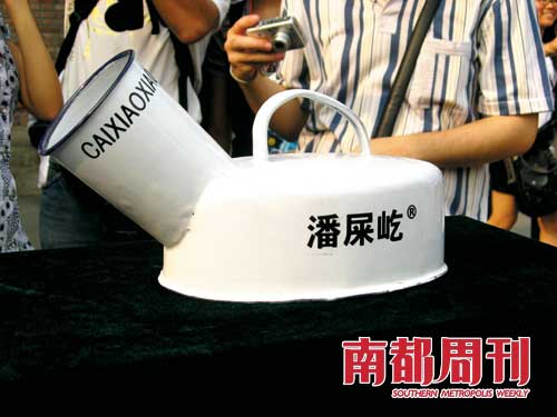 蔡小小的“名人小便器”引来了会意的笑声。蔡小小推着小车,摆着几个写有“潘屎屹”、“芙蓉姐姐”字样的尿壶,不停吆喝。