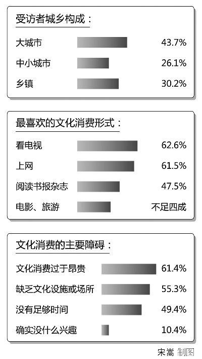 编辑点评:调查结果显示,由区域发展不平衡带来的文化消费差距比较大,在某些地区,民众能够接触、了解和享受的文化消费形式还十分有限。《文化产业振兴规划》中部署的跨区域整合、繁荣城乡文化市场这一重点工作,其重大意义正在于此。期待《文化产业振兴规划》的出台,能让文化产业在全国范围内有更快、更均衡的发展,能有更多、更丰富的文化产品。(记者 孙墨笛 记者 杨 暄)