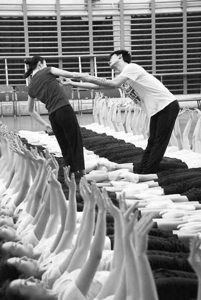 在缠绵的昆曲背景音乐中,一群着粉色T恤、头发高高挽起的姑娘袅袅婷婷地舒展四肢,轻轻柔柔地转身,低眉抬头间,是那风情万种的笑靥……这是大型音乐舞蹈史诗《复兴之路》第一章《山河祭》在中国农业大学体育馆的排练现场。