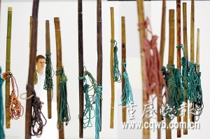 一走进美术馆的大门,首先映入眼帘的就是一大片山城棒棒军的生存工具——棒棒。这些棒棒每一根都绑着一根绳子,被悬挂在美术馆中。走入棒棒森林中,却发现没有一根棒棒是相同的,它们有的是竹子,有的是木头,有的绑着胶带,有的已经开裂。据艺术家廖邦铭介绍,这些棒棒都是他以100元一根的价格从棒棒们手中收购回来的,在收购过程中,很多棒棒们都很兴奋,因为他们觉得成本不过2元钱的棒棒居然能卖到100元,还能成艺术品,简直不可思议。