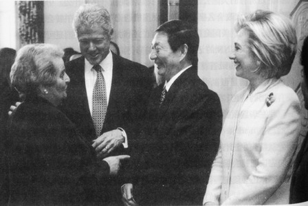 中国政府代表团这一次应克林顿总统的邀请访问美国,我们认为是非常成功的,尽管我们每一个成员都准备在美国被打得鼻青脸肿。我曾向尚慕杰大使请教,我怎么才能不被打得鼻青脸肿呢?他说,你要alwayskeep a smilingface(总是面带笑容)。但是我脾气很坏,要我装出笑脸,我是装不出来的。虽然没有装出笑脸,我仍然受到美国人民的欢迎。因此,我觉得中美两国人民的友好是有着非常深厚的历史基础和群众基础的。保持中美两国人民的友好关系这样一个政策,是美国共和党和民主党一致的政策。首先,是共和党的尼克松总统打开了中美两国友好关系的大门,我很高兴今天能够会见尼克松总统的女儿;是民主党的卡特总统建立了中美两国之间的正式外交关系;然后是里根总统和布什总统进一步地促进了中美两国之间的友好合作关系;然后是民主党的克林顿总统和江泽民主席通过成功的互访,致力于建立一种建设性的战略伙伴关系。我认为这种友好关系不但是有利于中美两国人民的,也是有利于世界人民的。