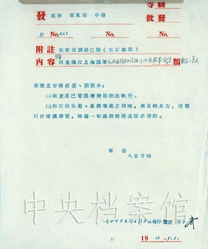 3.1949年5月8日,中央军委关于同意围攻上海部署的电报