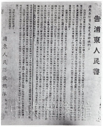 4. 1949年5月2日,浦东人民解放总队发布《告浦东人民书》,号召浦东人民行动起来,维护地方治安,配合解放军夺取最后胜利
