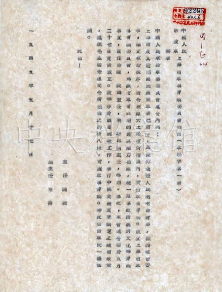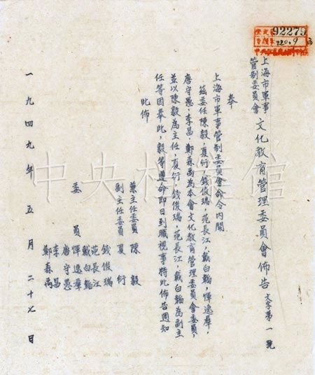 上海解放后,上海市军管会成立,下设军事、政务、财政、文化教育四个方面的接管委员会。1949年5月29日,上海军管会文化教育管理委员会派军代表接管大中华唱片厂。6月2日,大中华唱片厂恢复生产,灌制了解放区歌曲《解放区的天》、《军队向前进》、《唱胜利》、《蒋家兵呀一团糟》、《向人民解放军致敬》、《扭向新中国》、《快乐的农村》等七种,准备由各广播电台播送。8月,以“人民唱片”为牌号出版唱片。到年底,共出版60个牌号,约1万张粗纹唱片,其中有歌曲《东方红》、《国际歌》、《咱们工人有力量》、《赞美新中国》以及歌剧、民乐、京剧、越剧、川剧、沪剧、山东快书等。