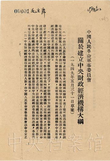 在人民解放战争即将在全国范围胜利的情况下,为了尽可能迅速地、有计划地恢复与发展人民经济,借以供给目前人民革命战争的需要及改善人民生活,亟待建立中央的财政经济机构。