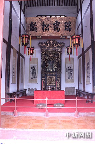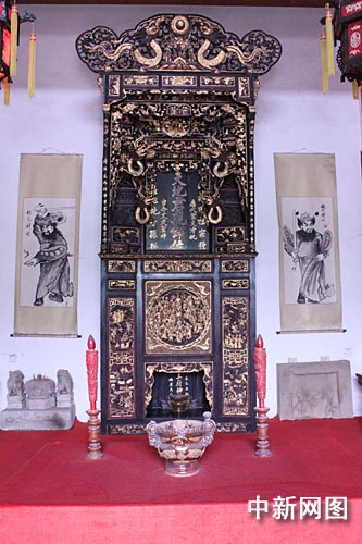 根据中华传统民俗,民间祭祀祖先的场所是祠堂,祠堂是血脉的圣殿,祖先的象征。神龛是祠堂内最重要的器物,是陈列祖宗牌位的地方,设于祠堂正厅,神龛前设香位作放置香炉及供品之用。管内专家称,这满金雕花神龛,巍峨壮丽,其形象之高大、用金之厚重、雕刻之精美,堪之为世间所罕见。