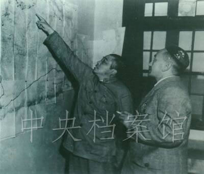 16.彭德怀司令员在兰州和新疆维吾尔族代表艾买提研究新疆地形的照片