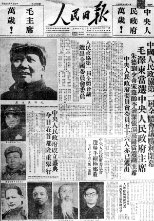 “ 中华人民共和国的诞生与中央人民政府的成立,是中国几千年来历史上一个划时代的伟大事件,被帝国主义、封建主义、官僚资本主义所统治的旧中国的历史时代已经结束,人民民主的新中国正开始其新的纪元。中国人民已由过去被压迫被剥削的奴役地位,一跃而为现在管理国家政权的主人翁。占人类总数四分之一的中国人,从此在地球上站立起来了!”