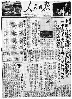 “ 共产党的新闻机构报道,约二百万人聚集在一起收听这个历史性的宣告,所有人的目光都聚集在毛泽东升起的那面新中国的标志——五星红旗,乐队演奏新国歌《义勇军进行曲》。其后,举行游行仪式。军队接受朱德将军的检阅,编队经过天安门,有的配备最新的美国大炮、坦克以及从国民党手中缴获的装甲车。共产党空军轰炸机编队飞行,烟花爆竹和其他游行活动直至深夜。有报道指出,这种欢庆活动将持续3天左右,与推翻清政府统治的‘双十节’共庆。”