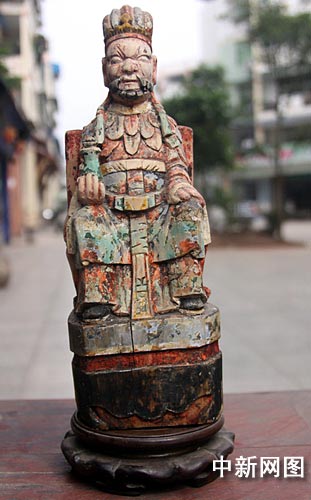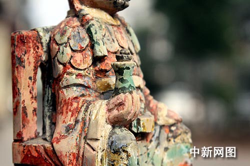 中新网成都9月28日电(刘龙泉)9月28日,记者在四川长宁县城“永胜收藏馆”里看到了一尊“酒圣公”木雕神像。该神像用柏木雕成,宽11厘米,相高22厘米,连座高30厘米;神像为男性,坐在太师椅上,头戴孔明帽,眼睛大而突出,胡须浓密,一副文武兼备的样子。他的左手放在左大腿上,右手则向上持有一酒瓶,酒瓶上盖有木塞。