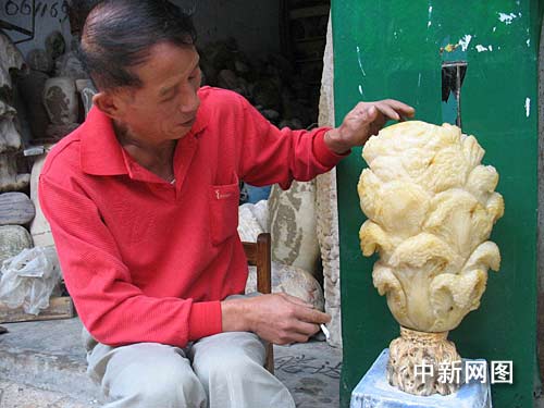 中新网成都10月4日电(阳明) “10月1日上午看了新中国成立60周年阅兵式,那一排排整齐的队列、一种种先进的武器、一辆辆绚丽的花车、一个个欢庆的场面,让我非常激动和振奋,气势磅礴的大阅兵一结束,我就有一股冲动,那就是制作一件作品,祝愿共和国永远生机勃勃!各项事业蒸蒸日上!”10月4日,四川宜宾县奇石艺人江庭富指着新完成的作品“大白菜”告诉记者。