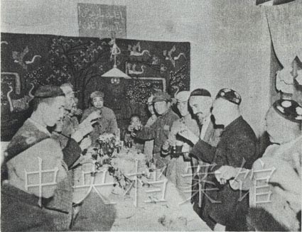 6.旅居兰州的维吾尔族同乡会成员在请缨会上举杯,预祝新疆早日获得解放