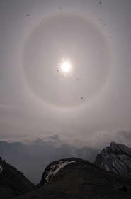 在长白山主峰白云峰上,正在考察的吉林省长白山文化研究会会长张福有,忽然看到奇光,太阳从浓云中露出,在天池云层上方的淡云层中形成日晕光环,呈非常规则的同心圆,太阳周围是暗红色的,最外圈是由红黄蓝紫等颜色构成的圆虹,令人惊叹。