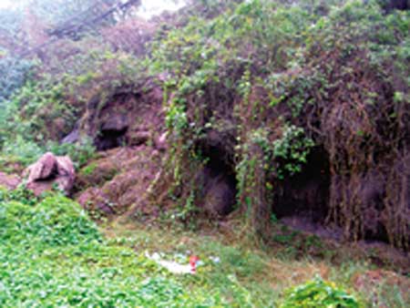在海珠区石榴岗路走了三个来回,最后找到小黄,才看到在被几排废品收购店、修车铺等遮挡住的一片乱草山岗。但却无法近前:疯长的杂草、遍地的垃圾,连前面突出的海蚀洞都几乎看不出来了;滚落地上的红砂岩,才告诉我们这个几成荒山的地方确实不平凡。此前种下的外围绿化带树木,由于无人管理,也变成荒芜杂树。